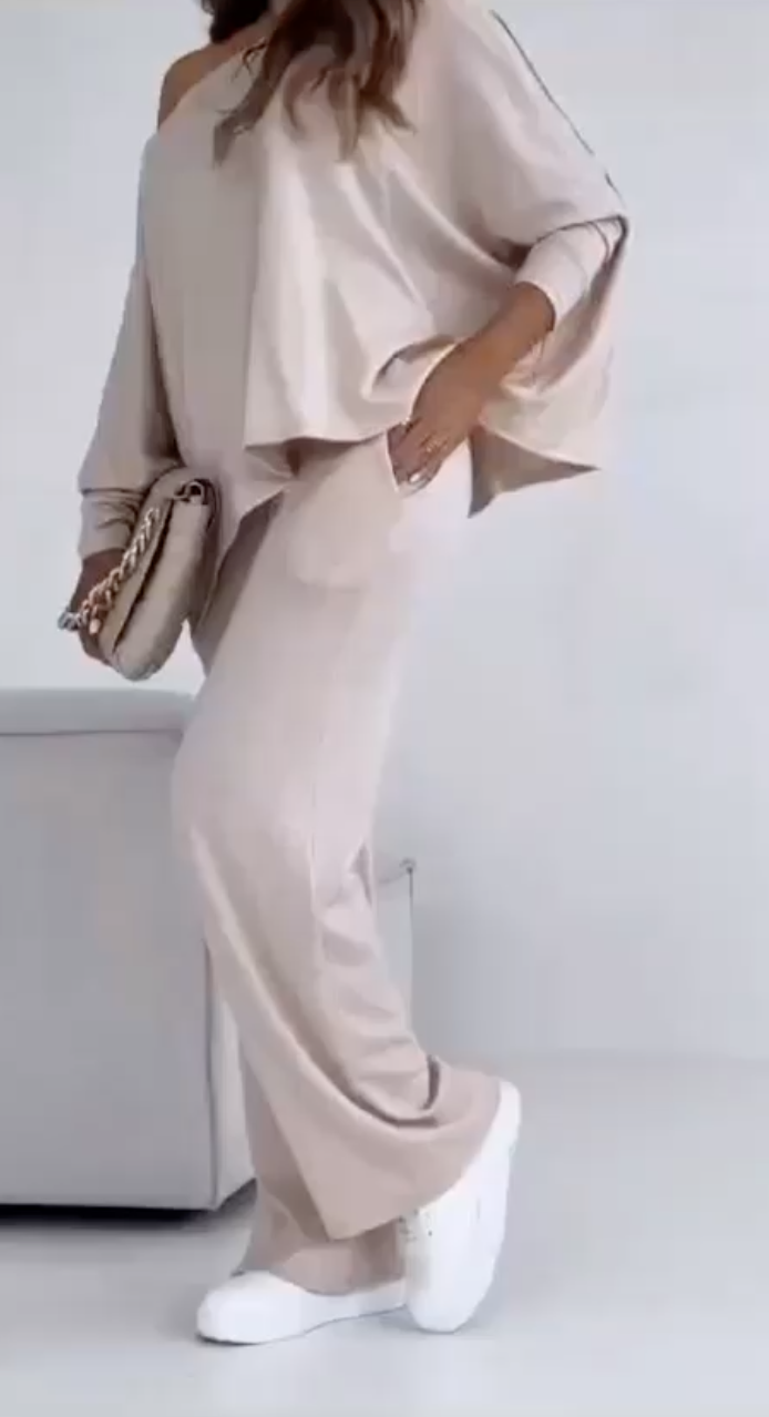 Sfrutta il completo Sandy per conferirti comodità ed eleganza in ogni occasione. Il pantalone a palazzo alto in vita si unisce alla maglia monospalla per un look unico e versatile. Lasciati ispirare dal nostro completo senza rinunciare all'eleganza, sempre perfetto anche durante il giorno.